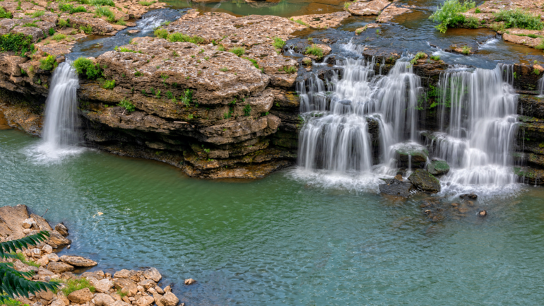 Rock Island State Park is an 883-acre park located on the headwaters of Center Hill Lake at the confluence of the Caney Fork, Collins, and Rocky Rivers. Known for its rugged beauty and impressive waterfalls, the park includes the Caney Fork River Gorge, one of Tennessee's many natural treasures. The gorge is a popular location for hiking and swimming, offering deep-blue pools, scenic trails, and cascades, including Great Falls, a 30-foot waterfall located below the 19th-century cotton textile mill that it powered more than 100 years ago. Visitors can also extend their stay at one of the park's cabins or campsites.
